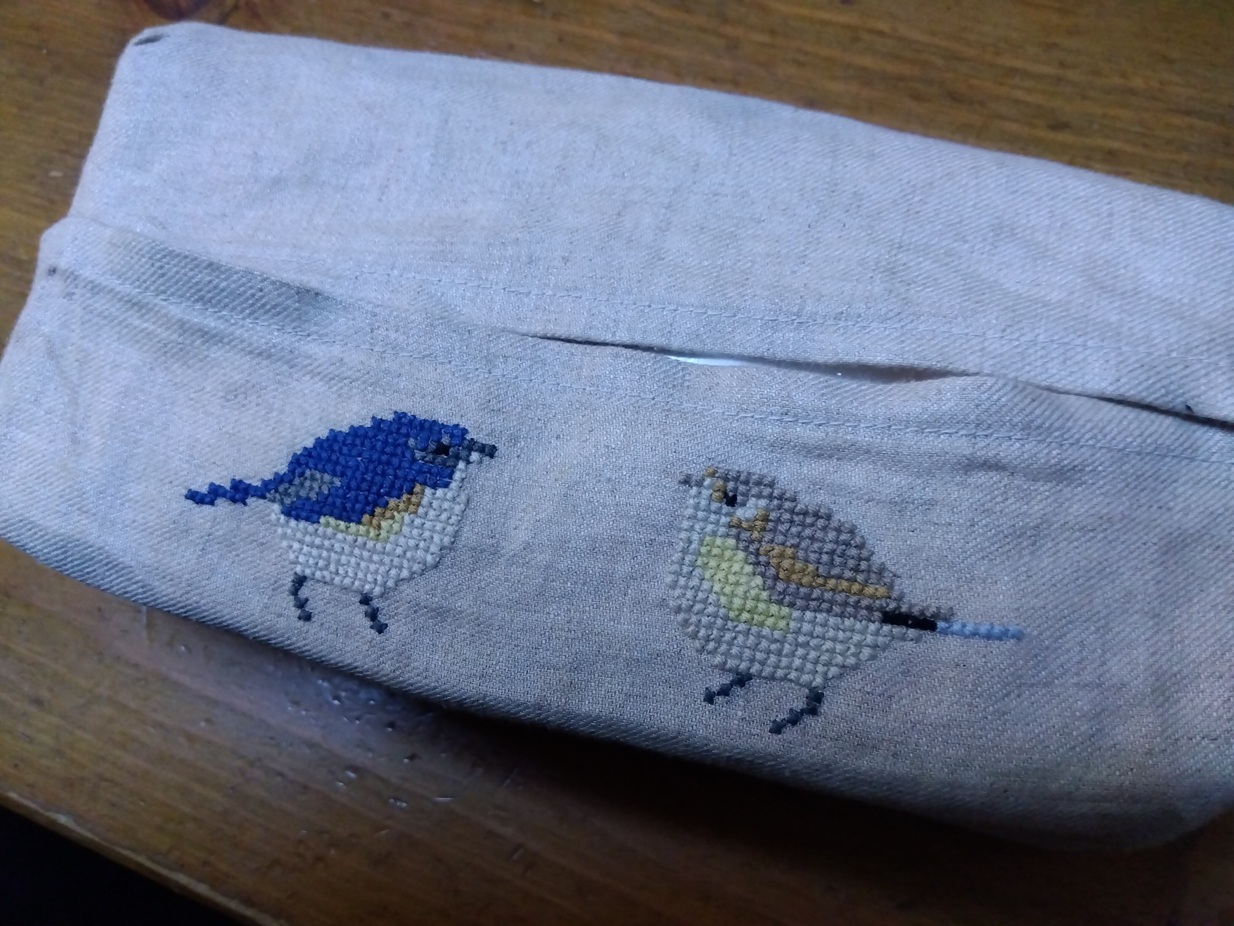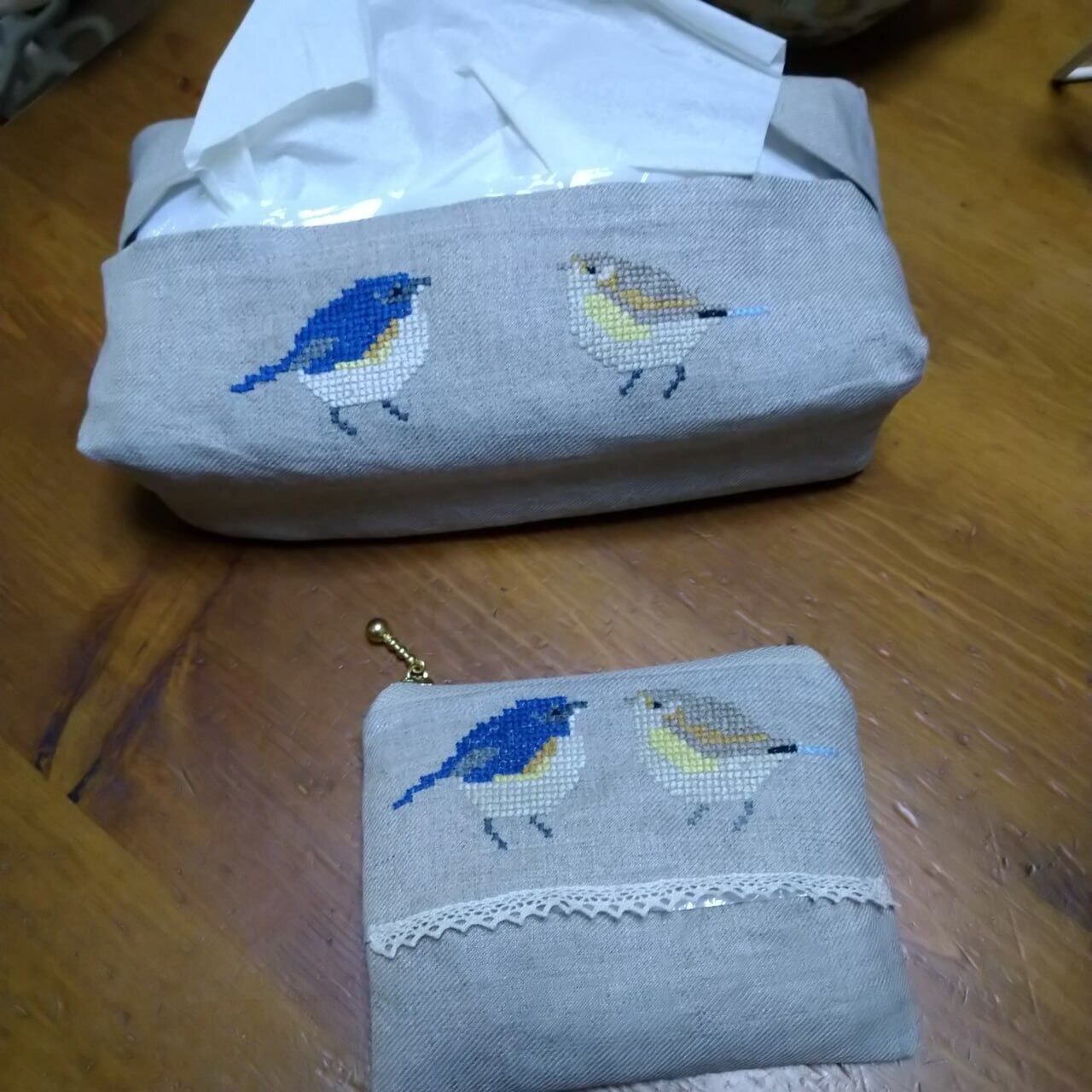 ポケットティッシュケースと同じルリビタキペアをクロスステッチ刺繍図案におこして仕上げました♪