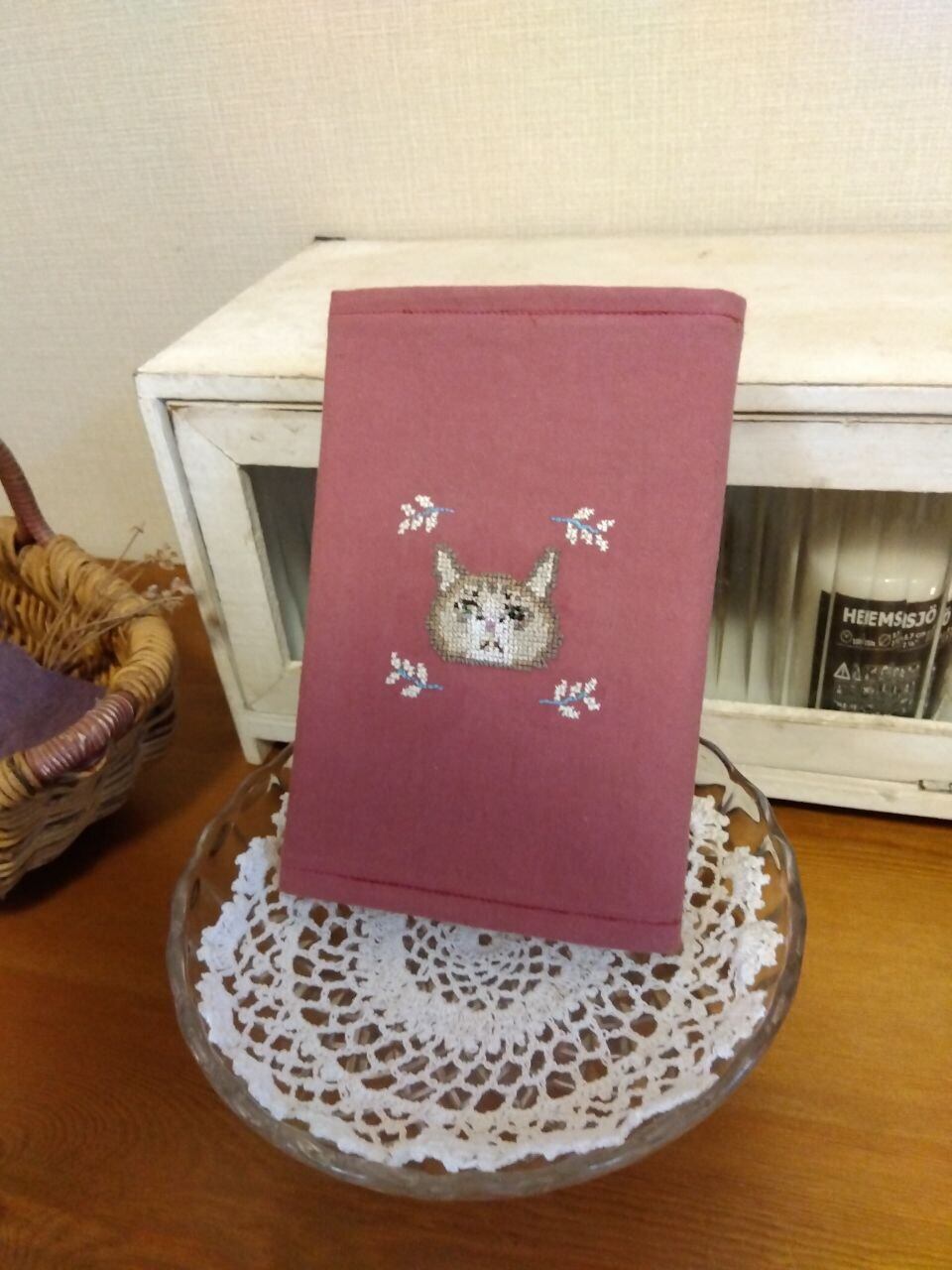 ♪手刺繍ブックカバー♪まめちゃん&万葉もめん B(四六版本の幅薄めタイプ)